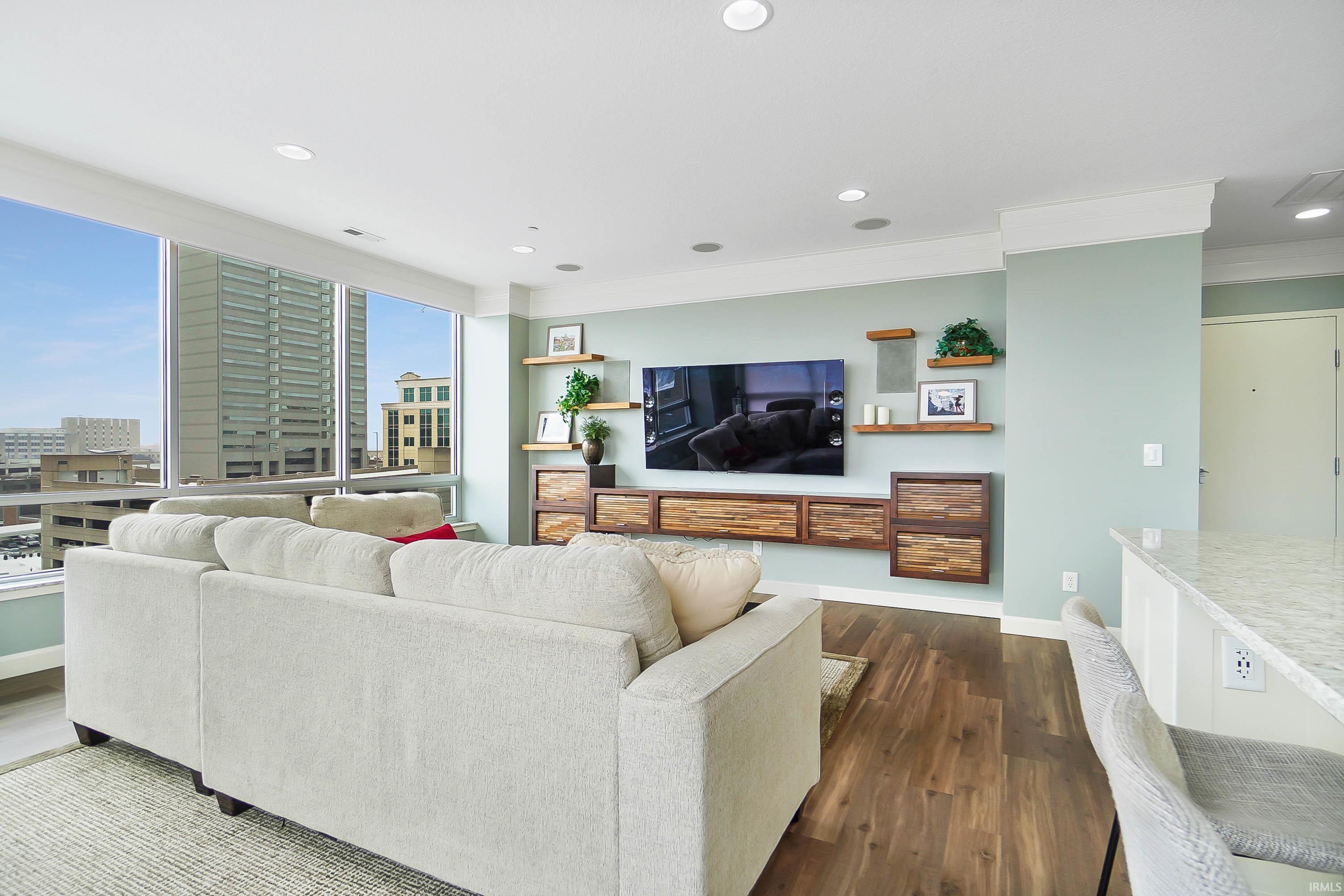 This spacious, beautifully updated, 2-bedroom, 2-bath home features an open floor plan, fresh paint, and energy-efficient glass walls that showcase stunning city views. The modern kitchen boasts custom cabinetry, granite countertops, a custom wood breakfast bar, new stainless steel refrigerator and dishwasher. The primary suite offers a large walk-in closet, dual vanities, and a tiled walk-in shower. Additional highlights include a flex space/den, a spacious secondary bedroom and a laundry room with stackable washer/dryer, countertops, and ample storage. The living room has a sleek built-in entertainment area, floor-to-ceiling windows and window seats with hidden storage, perfect for both style and function. Enjoy convenience with 3 deeded parking spaces in the covered garage (2nd & 4th floors), storage closet on 3rd floor and access to the 5th-floor common outdoor patio with modern furnishings and a built-in grill. Catalyst fitness is open in the basement of the building with reduced membership prices to residents. This move-in ready condo combines modern design and convenience.