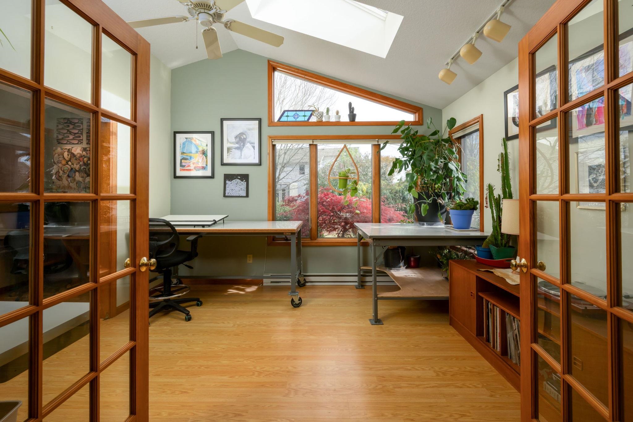 Beautiful ranch with new appliances, new paint, new carpet and workareas that are so cleverly designed. This home has a wonderful open flowing areas that can be closed off for privacy. The gas log fireplace flanks the cathedral ceiling in the living room. There are two offices-one in the front of the home and one in the back. One with built in bookshelves and the second more creative area with lots of sunlight. Lots of creatively designed desks and bookshelves. The kitchen has solid surface countertops, plenty of storage and opens to the family room with a breakfast nook that opens to the patio. One of the best features is a huge tiled sunroom filled with screens for three season enjoyment. Gardens have been structured and lots of privacy in the backyard. Backyard is fully fenced with a wrought iron fence. Master bedroom is large with walk in bath-large jetted tub and separate shower.