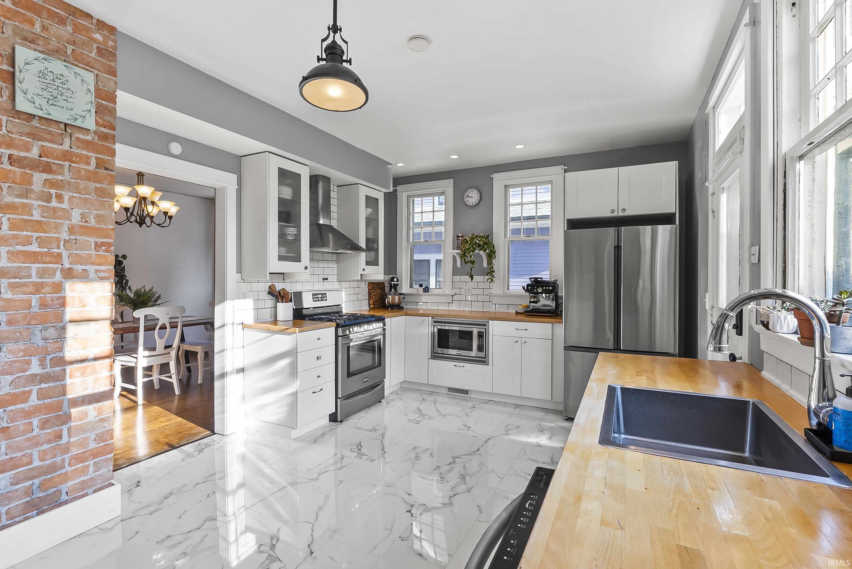 This beautifully preserved historic home offers nearly 1,900 sq. ft. of charm with 3 bedrooms and 1.5 baths, ideally located in the heart of West Central Fort Wayne. Step inside to a welcoming foyer highlighted by original wood trim, staircase, and floors. The living room boasts a wood-burning fireplace flanked by built-in shelves and an abundance of natural light. A spacious formal dining room showcases the home’s original trim, while the kitchen features white cabinetry, butcher block counters, a subway tile backsplash, and stainless steel appliances—all just 3 years old. Outside, enjoy an extended paver patio perfect for relaxing mornings or cozy evenings. Conveniently close to downtown, parks, and shops.